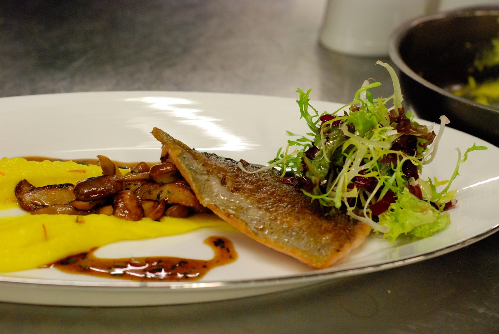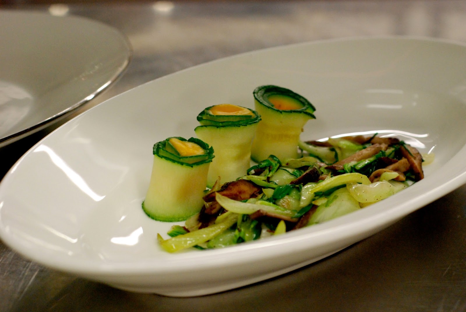 Pošírovaný mořský vlk přelitý omáčkou z dashi, citrónové trávy a másla, bok choi restovaný se shi take, cuketové rolky s dýňovým pyré