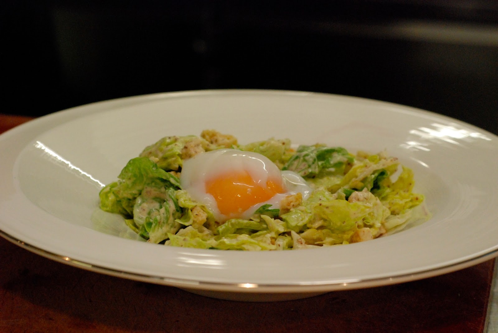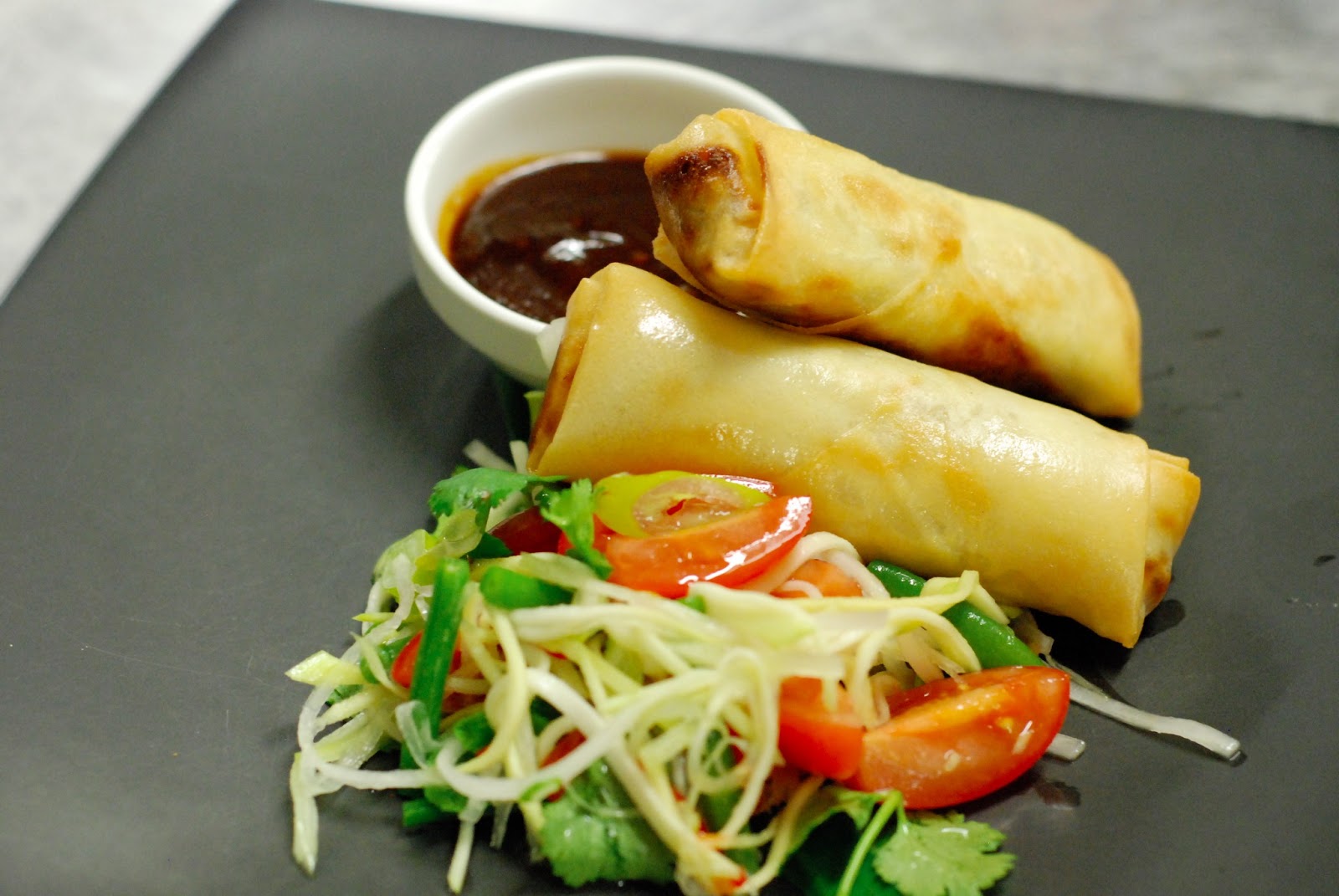 Caesar salát s pošírovaným vejcemJarní závitky s kachnou a omáčkou hoisin, salát ze zeleného manga a papáji