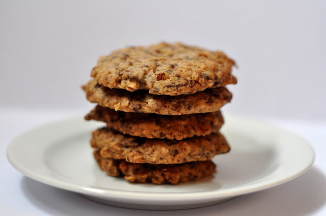 Z másla a cukru vyšlehejte krém, zašlehejte do něj vajíčko. Přidejte promíchané suché přísady a promíchejte s máslovou pěnou. Pokud se vám směs zdá příliš lepivá a mokrá přidejte mouku/vločky. Patlejte placičky podle vlastního uvážení. Spíše doporučuju menší a ne moc vysoké. Mě vedla velikost ořechů, které jsem měla nasekané opravdu na hrubo. Trošku se v toubě rozlezou, proto je na plech nedávejte moc těsně k sobě.